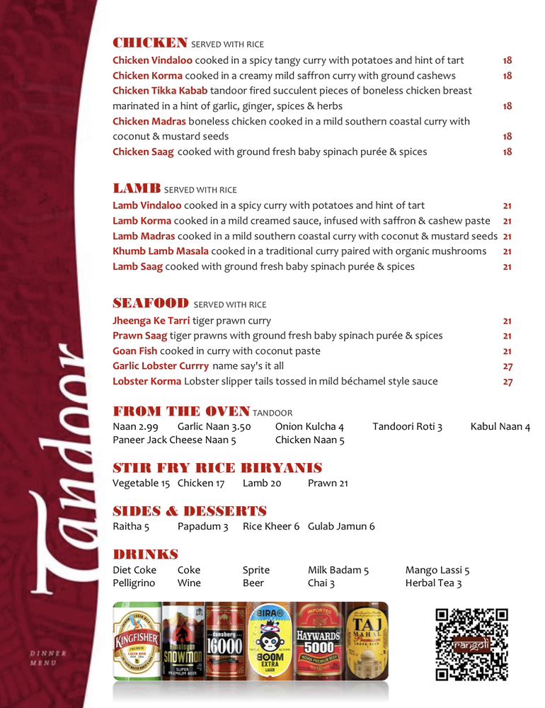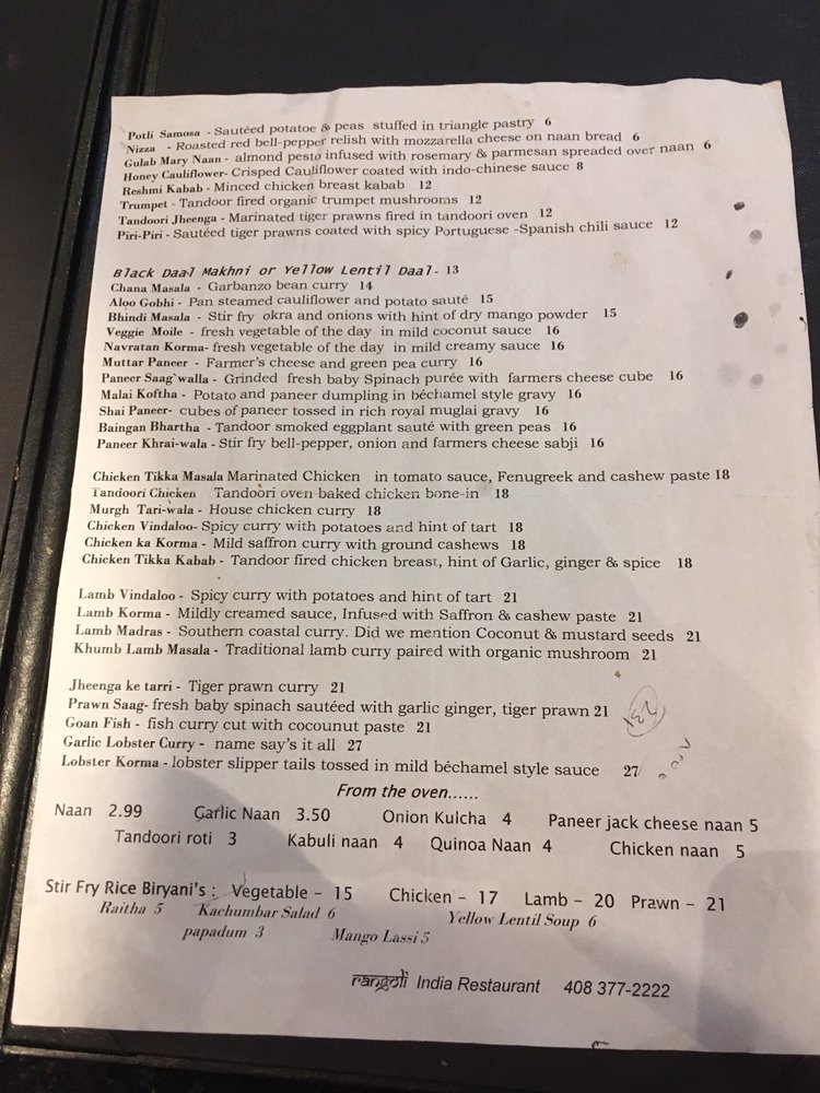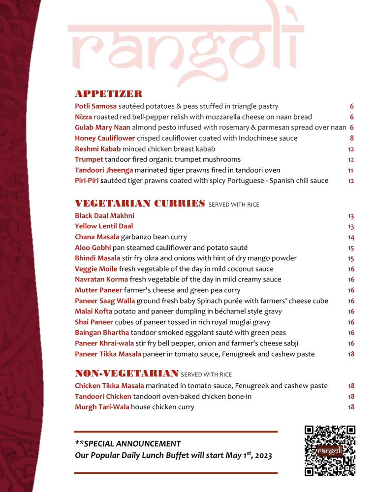 Rangoli India Restaurant in San Jose offers a wide range of classic Indian dishes with a focus on vegetarian and pescatarian options. The menu includes favorites like Chana Masala, Aloo Gobhi, and Chicken Tikka Masala. The restaurant provides a classy dining experience with amenities like private dining, outdoor seating, and wheelchair accessibility.